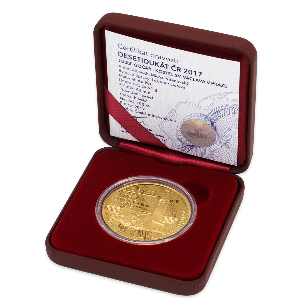 Zlatý desetidukát, největší ražba Dukátové řady, jejímž motivem se v roce 2017 stalo umění první republiky, představuje kostel sv. Václava architekta Josefa Gočára – perlu meziválečného sakrálního stavitelství.