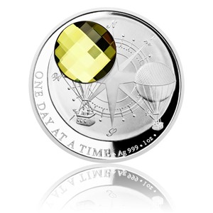 That is why the talented medaillist Petra Kobrlová, DiS., has chosen hot air balloon as the dominant motif of the coin, whose theme is enjoying life. The so called envelope, the main bag-like part of the balloon which holds the hot air, is made up of a cut crystal stone on this coin. Complemented by the silver relief is a traditional Czech glass and is an essential feature of the product series Crystal Coin. The world famous Jablonec company Preciosa has taken extreme care in the processing of the crystal components.The reverse of the coin also bears another smaller aerostat, a directional compass rose in the background and an English text ONE DAY AT A TIME on the preiter. The obverse side of the coin belongs to the attributes of the the issuer, thus the island of Niue, which provides a license to mint coins for the Czech Mint, and bears the name and portrait of Queen Elizabeth II., the year of issue of the coin 2017 and the nominal value of 2 DOLLARS (NZD).