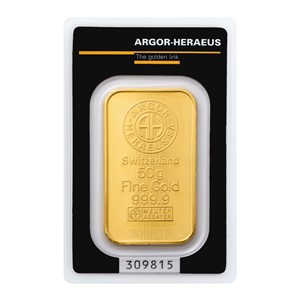 Investiční zlato o hmotnosti 50 g. Na každé investiční cihle nebo slitku jsou vyraženy údaje – logo vydavatele Heraeus, hmotnost, ryzost kovu, pečeť kvality a výrobní číslo. Cihlička je číslovaná. Slitky o hmotnosti od 1g do 100g jsou ražené a společně s certifikátem jsou zataveny v ochranné fólii. Tato folie s certifikátem nesmí být porušena.