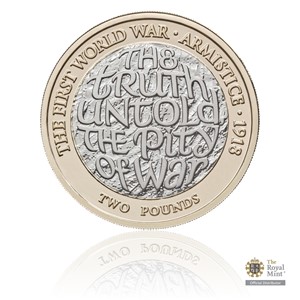 Designér Stephen Raw se při tvorbě mince inspiroval osudem britského básníka Wilfreda Owena. Ten se proslavil naturalistickými verši o bojích první světové války, které psal přímo v zákopech, a padl pouhý týden před vyhlášením příměří. Reverzní strana ražby nese verše z jeho básně Strange Meeting. Averzní strana pak předkládá atributy emitenta mince – portrét královny Alžběty II. a opis „ELIZABETH II DEI GRA REG FID DEF“ (Alžběta II., z Boží milosti královna, ochránkyně víry).