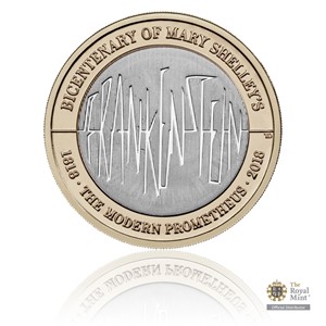 Pamětní mince 200. výročí vydání románu Frankenstein UK 2018 stand