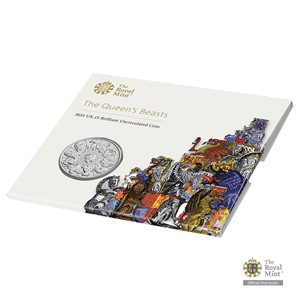 Reverzní straně mince vévodí portrét královny Alžběty II., který je obklopen bustami deseti heraldických zvířat zachycených v dynamických pózách. Kompozici dotváří text THE QUEEN’S BEASTS (královnina zvířata) a letopočet emise 2021. Vyobrazení královny najdete také na averzní straně, která je věnována atributům emitenta mince. Portrét z profilu doprovází text ELIZABETH II D G REG FID DEF (Alžběta II., z Boží milosti královna, ochránkyně víry) a nominální hodnota 5 POUNDS (GBP).