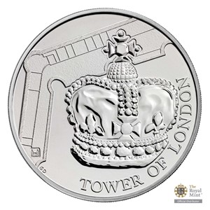 Reverzní strana mince předkládá nejen krkavce, ale také část půdorysu Toweru. Tento prvek je společný všem čtyřem mincím minisérie. Averzní strana pak nese nominální hodnotu 5 POUNDS (GBP), profil královny Alžběty II., opis „ELIZABETH II D G REG F D“ (Alžběta II., z Boží milosti královna, ochránkyně víry) a ročník emise 2019.