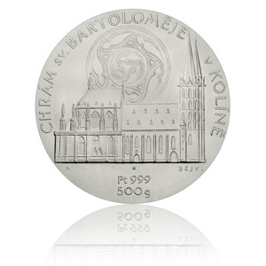 Autorem medaile je Jaroslav Bejvl, jenž mistrovsky zpodobnil tento architektonický klenot na averzu spolu s nápisem CHRÁM SVATÉHO BARTOLOMĚJE, označením ryzosti Pt 999 a hmotnosti 500 g. Reverzu pak věnoval vkusnou kompozici tvořenou detailem vysokého chóru chrámu v pozadí a reliéfní bustou Petra Parléře v popředí. Text po obvodu medaile uvádí PETR PARLÉŘ STAVITEL VYSOKÉHO CHÓRU CHRÁMU SV. BARTOLOMĚJE. Medaile je na hraně číslována a uložena v luxusní vykládané etuji ze světlého dřeva. Její ražba je limitována pouhými 12 kusy. Nepromarněte šanci uložit své peníze s rozumem i citem zároveň. Pohled na aktuální vývoj tržní ceny platiny nasvědčuje velmi slibnému zhodnocení této znamenité sbírky!