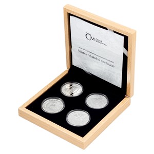 Čtyřdílný komplet mincí je uložen do luxusní dřevěné krabičky.