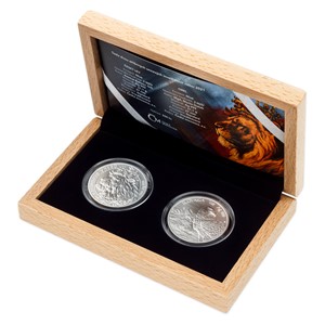 Sada, jejíž celková hmotnost čítá dvě trojské unce ryzího stříbra, obsahuje dvě investiční mince České mincovny – Českého lva a Orola s ročníkem 2021.