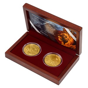 Komplet je uložen do luxusní dřevěné etue. V naší nabídce najdete také další varianty investičních mincí vyrobené ze zlata i stříbra. To vám umožní jednoduše regulovat, kolik finančních prostředků uložíte do drahých kovů.