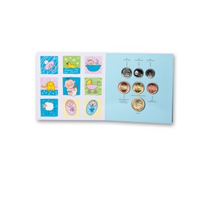 Oběžné mince roku 2013 vložené ve skládačce doplňuje originální žeton z materiálu Nordic Gold (slitina CuAl5Zn5Sn1). Na averzní straně je vyobrazeno spící miminko obklopené hvězdami štěstí. Motiv uzavírá opis „k narození dítěte“ a rok „2013“.