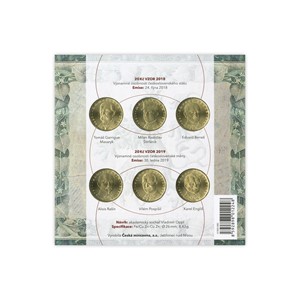 Trojice mincí vyražených v roce 2018 nese portréty zakladatelů republiky Tomáše Garrigue Masaryka, Milana Rastislava Štefánika a Edvarda Beneše. Mince s letopočtem 2019 jsou pak ozdobeny portréty nejvýznamnějších meziválečných finančníků Aloise Rašína, Viléma Pospíšila a Karla Engliše. To vše v podání akademického sochaře Vladimíra Oppla, autora klasické dvacetikoruny se svatým Václavem.