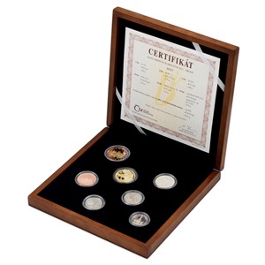 Komplet je doplněn číslovaným certifikátem pravosti, který vyrobila Státní tiskárna cenin, a uložen do elegantní dřevěné etue.