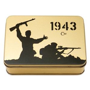 Ilustrace na víčku krabičky nese siluety sovětských vojáků na východní frontě – je inspirovaná propagandistickými plakáty, které vyobrazují rudoarmějce v hrdinných pózách. Voják vlevo třímá nad hlavou legendární samopal Špagin, zatímco odstřelovačka po jeho boku hledí skrz puškohled smrtící opakovačky Mosin-Nagant. Válečný výjev je doplněn výročním letopočtem 1943 a značkou České mincovny.