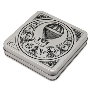 Všechny čtyři mince si můžete uložit do této stylové sběratelské krabičky, která je, jak jinak, vyrobena z plechu. Její víčko zdobí grafika vyvedená ve stylu starých vydání verneovek a uvnitř najdete výpravnou ilustrovanou přílohu.