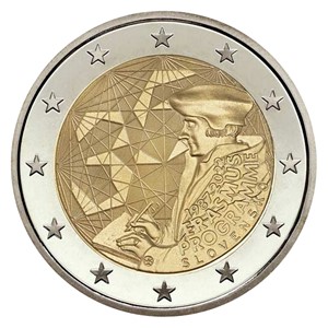 Averzní straně mince, která je dílem francouzského rytce Joaquina Jimeneze, vévodí polopostava Erasma Rotterdamského inspirovaná historickou malbou. Paprsky na pozadí symbolizují celoevropskou výměnu myšlenek. Reverzní strana pak předkládá všechny náležitosti platné mince s nominální hodnotou 2 €.
