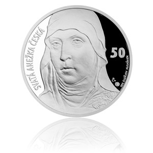 Dominantou averzu stříbrné ražby je charismatický portrét světice spolu s nápisy SVATÁ ANEŽKA ČESKÁ, INV. OLDŘICH KULHÁNEK a číslovkou 50, jež vyjadřuje nominál bankovky, která byla předlohou pro tvorbu medaile. Převedení tématu z papírové padesátikoruny do kruhové podoby se ujala MgA. Klára Melichová, dcera Oldřicha Kulhánka, sama nadaná grafička. Reliéfní formu pak motivu vtiskl akademický sochař Vladimír Oppl. Reverz oba výtvarníci poskytli detailu přejatému z rubové strany bankovky – okrasnému písmenu A. Zpestřete originálním způsobem své numismatické kolekce!