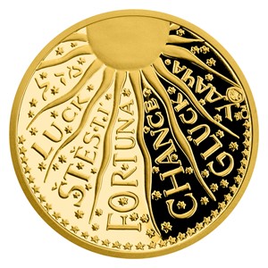 – to jsou slova, která si se štěstím spojuje akademická sochařka Majka Wichnerová. Věnovala jim reverzní stranu pamětní medaile, doplnila je cizojazyčným překladem, dvouocasým českým lvem a sluncem. Motiv slunce vévodí také averzní straně – mezi jeho paprsky je zasazeno slovo ŠTĚSTÍ v sedmi jazycích.