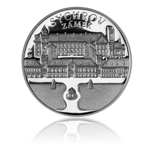 Počátky historie zámku sahají do 15. století. Původně zde byla tvrz, později panský kamenný dům a koncem 17. století malý barokní zámek. Teprve od roku 1820 začíná doba největšího stavebního a uměleckého rozkvětu zámku, spojená s rodem Rohanů. Rod Rohanů pocházel původně z Bretaně a patřil mezi desítku nejvlivnějších šlechtických rodů Francie. Po Velké francouzské revoluci jedna z větví rodu Rohanů Francii opustila, přesídlila do rakouské monarchie a jejich hlavním sídlem se stal zámek Sychrov. Původní zchátralý barokní zámeček velkolepě přestavěl již první majitel v duchu empíru. Stavební vývoj však pokračoval a dnešní novogotická podoba pochází z poloviny 19. století, z doby knížete Kamila Rohana. Na vysoké umělecké hodnotě exteriérů i interiérů zámku se podílelo mnoho českých umělců a řemeslníků. Kníže Rohan věnoval velkou pozornost i budování zámeckých zahrad a parku. V tomto období bylo dosaženo vzácné harmonie všech exteriérů staveb, zařízení a výzdoby interiérů a také parků a zahrad. V dnes státním zámku probíhají rozsáhlé rekonstrukce a restaurace s cílem navrátit zámku novogotickou podobu poloviny 19. století. Na averzní straně medaile je zámek zobrazen z ptačí perspektivy. Tak nejvíce vyniknou exteriérové prvky a rozlehlost a členitost jednotlivých staveb, stejně jako dvě dominanty zámku – Bretaňská a Rakouská věž. Vyobrazení z nadhledu umožňuje také zachytit spolu se zámkem i část zahrady s altánem. Ve vrchní části medaile je v opisu text SYCHROV ZÁMEK. Na reverzní straně je v nízkém reliéfu zachycena část výzdoby interiérů, stropu z knížecího salonu ze severního křídla zámku. Centrálně umístěný erb rodu Rohanů, dělený štít, drží po stranách dva lvi. Nad štítem je knížecí koruna s erbovním pláštěm. Limitovaná emise 1000 kusů.