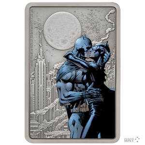 Reverzní strana neobvyklé obdélníkové mince předkládá vášnivý polibek Batmana a Catwoman. Komiksoví znalci jistě poznají, že jde o moment z příběhu „Ticho“, který vyšel i v českém překladu. Kolorovanou scénu doprovází reliéfní pozadí nočního Gothamu. Averzní strana mince pak nese atributy jejího emitenta, kterým je tichomořský ostrov Niue: jméno a portrét královny Alžběty II., letopočet vydání mince 2020 a nominální hodnotu 2 DOLLARS (NZD). Oficiálně licencovaná mince je dílem Novozélandské mincovny.