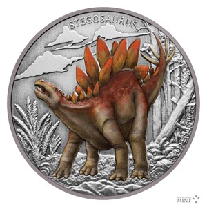 Čtvrtá stříbrná mince ze sběratelského cyklu věnovaného dinosaurům představuje stegosaura.