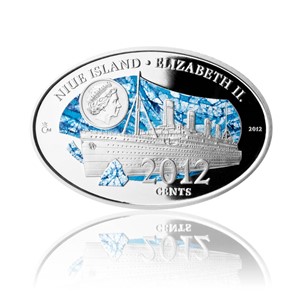 Royal Mail Steamer Titanic byl zaoceánský parník, zkonstruovaný pro osobní dopravu mezi Anglií a Spojenými státy. Na svoji první plavbu se vydal s 1300 pasažéry a 900 členy posádky na palubě. Luxusní loď společnosti White Star Line, pokládaná za nepotopitelnou, však narazila během své první plavby na ledovec a v noci ze 14. na 15. dubna roku 1912 se potopila. Zachránilo se pouze 700 lidí. Stříbrná mince ražená v novozélandské licenci má na averzní straně vyobrazen Titanik plující po moři, z něhož vystupují ledové kry. Kompozici doplňuje portrét a jméno královny Alžběty, nominál 2012 centů a název země Nový Zéland. Pozadí této strany mince je zpracováno barevným vitrážovým způsobem využívajícím nový prvek – kolorování. Na reverzní straně je umístěna kompozice složená z předmětů vylovených z moře – kompasu, lodního lístku a zvonu. Letopočty 1912 a 2012 a dvoujazyčný opis po obvodu mince vyjadřují 100. výročí zkázy Titaniku. Není bez zajímavosti, že na území Nového Zélandu se jedná o platnou nominální minci.