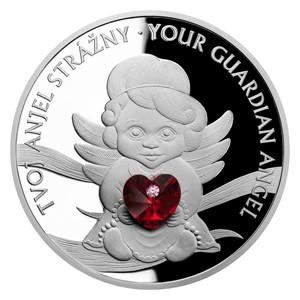 Stříbrná mince Crystal Coin - Anděl strážný se srdíčkem SK proof