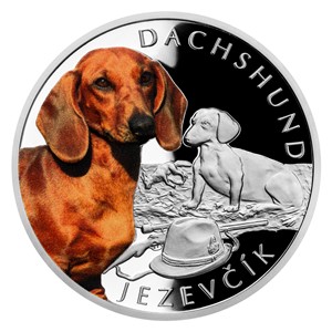 Druhá stříbrná mince České mincovny z cyklu Psí plemena je věnována jezevčíkovi.