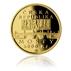Na averzní straně je zachycen most z dálky, doplněn trojicí heraldických zvířat a nápisem v řádcích ČESKÁ REPUBLIKA – MOSTY a nominál 5000 KČ.