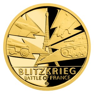 Doprostřed reverzní strany mince umístil medailér MgA. Josef Oplištil pařížskou Eiffelovu věž coby ikonu Francie. Bleskovou válku pak symbolizuje čtveřice blesků, do kterých je zakomponováno vyobrazení německých válečných strojů – stíhacího letounu Messerschmitt Bf 109, střemhlavého bombardéru Junkers Ju 87, obrněného transportéru SdKfz 251 a středního tanku PzKpfw III. Kompozici reverzu dotváří nápis BLITZKRIEG – BATTLE OF FRANCE (bitva o Francii). Averzní strana je společná celé minisérii Válečný rok 1940 – předkládá vlajky států, které čelily německému útoku, ve tvaru štítů a také další blesky. Protože licenci k vydávání pamětních mincí České mincovny poskytuje tichomořský ostrov Niue, nese averz jeho nezbytné atributy – jméno a portrét královny Alžběty II., nominální hodnotu 5 DOLLARS (NZD) a rok vydání 2020.