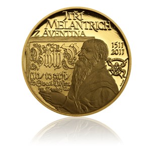 Jiří Melantrich z Aventina, významný renesanční tiskař a nakladatel žijící v 16. století, postupně vybudoval z převzaté tiskárny velký tiskařský a nakladatelský podnik evropského významu. Základem jeho ediční činnosti byla bible, kterou vydal několikrát, mj. pod názvem Bible Melantrichova zvaná též Melantriška. Věnoval se i tisku různé náboženské a mravoličné literatury. Počinem evropského významu bylo vydání české a německé verze Herbáře nebo také Bylináře. Melantrich vydal přes 200 náboženských a naučných knih v češtině, němčině, latině a řečtině. Pyšnil se vkusnou úpravou, úhledností, vysokou odborností, jazykovou úrovní a obrazovou výzdobou svých knih. Technická i jazyková úroveň jeho tisku byla jedna z nejlepších na světě a kvalitní byl i jeho vydavatelský program. Byl členem městské rady Starého Města pražského a roku 1557 mu císař Ferdinand I. udělil šlechtický titul společně s erbem nesoucím latinské heslo "Nec igni cedit nec ferro". V překladu to znamená "Nepodlehne ohni ani meči". Akademická sochařka Majka Wichnerová na averzní straně medaile vyobrazila Jiřího Melantricha podle jeho jediného dochovaného portrétu na titulním listu Bible vydané v roce 1570. Za ním umístila signet J.Melantricha, jeho tiskařskou a nakladatelskou značku, v pozadí výřez z titulního listu téže Bible. Motiv je doplněn letopočty 1511-2011. V horní části medaile je uvedeno jméno Jiřího Melantricha z Aventina. Na reverzní straně jsou vyobrazeny iniciály M, B, Q, velká zdobená počátečních písmena objevující se v Pěti knihách lékařských a v Bibli. Nad nimi je nápis „Bible česká“ a letopočet vydání 1570. Motiv reverzní strany uzavírá erb Jiřího Melantricha. Limitovaný náklad 400 kusů, číslováno.