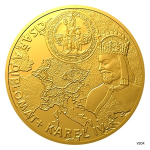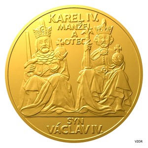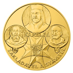 Reliéf velkolepé zlaté mince České mincovny, jejíž hmotnost činí celé tři kilogramy, připomíná krále Karla IV., který se představuje v úloze zakladatele a stavitele.